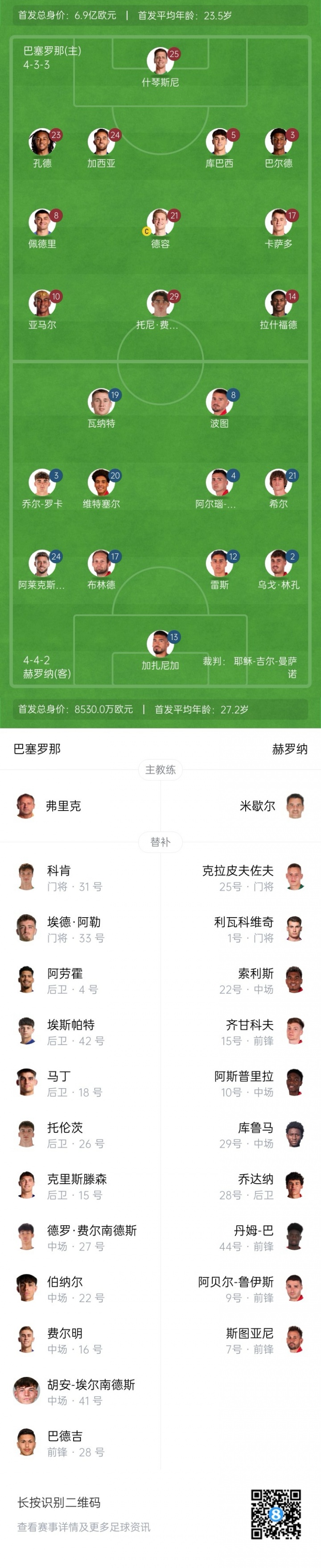巴萨杆位:25-什琴斯尼、3-巴尔德、5-库巴西、23-孔德、24-埃里克·加西亚、8-佩德里、17-卡萨多、21-德容、10-亚马尔、14-拉什福德、29-托尼·费尔南德斯