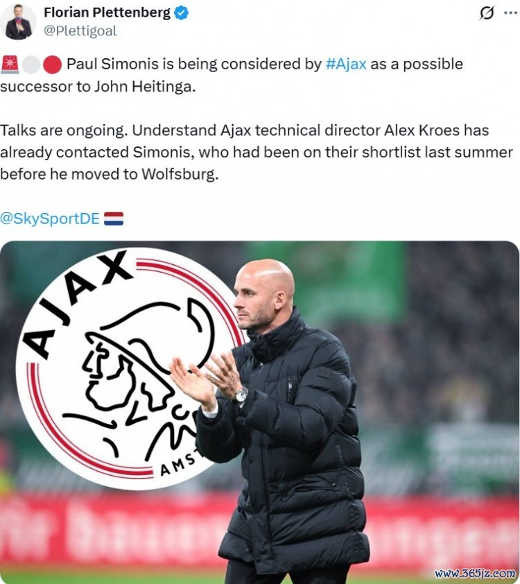 11月10日讯 据德天空记者Florian Plettenberg报道,在解雇海廷加后,阿贾克斯正在考虑聘请保罗-西蒙尼斯作为球队新帅。