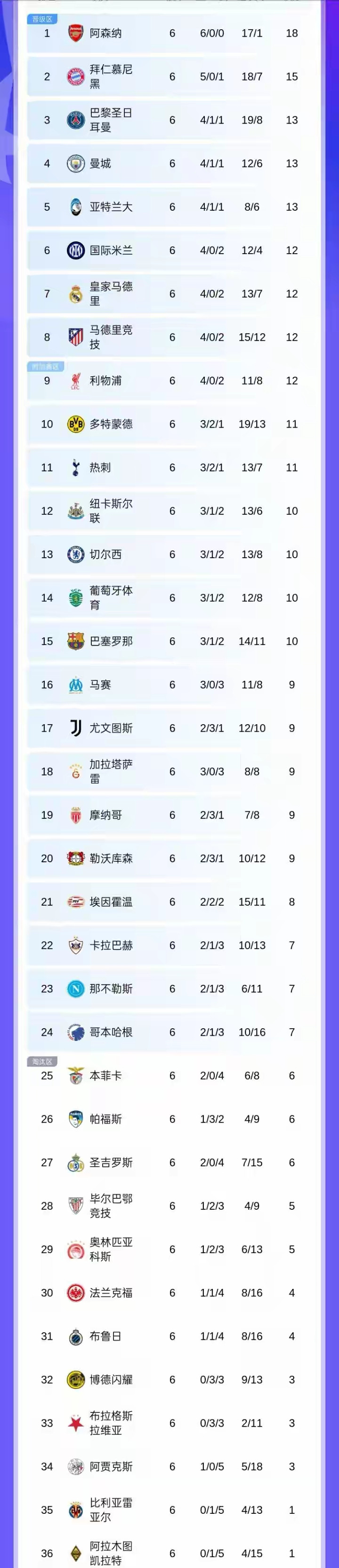 随着小组赛落幕,最新积分榜的排名极具看点。阿森纳以18分稳居榜首,拜仁5胜1负积15分紧随其后;巴黎、曼城、亚特兰大同积13分,凭借净胜球优势分列第三至第五位 。皇马则因这场失败 ,与国米、马竞、利物浦同积12分,因净胜球差距跌至第七位,虽仍锁定出线资格,但出回合赛的签运将面临考验。值得关注的是,巴萨、尤文等经典 豪门表现不及预期,均以积10分和9分位列积分榜中游,需要通过附加赛争夺出回合赛名额,昔日豪门的复苏之路充满荆棘。
