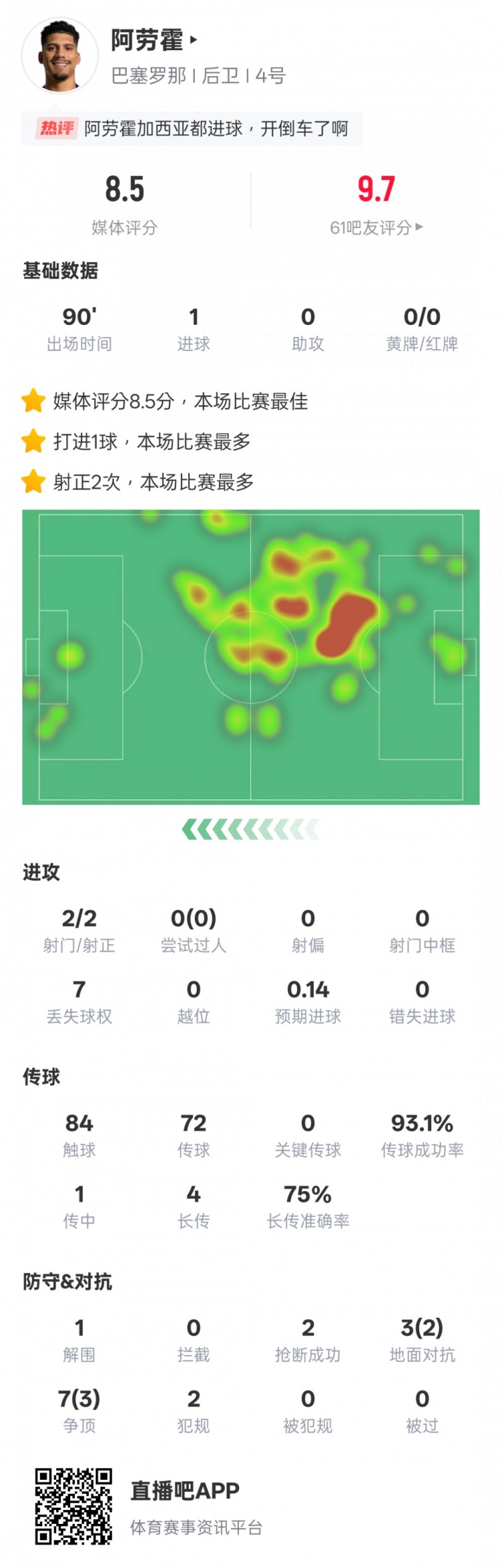 9月26日讯 2025-26赛季西甲第6轮,巴萨客场应战 3-1战胜皇家奥维耶多。阿劳霍杆位出战,打进1粒得分 ,免费欧洲杯直播2次完成抄截 ,传送球 成功率93.1%,评分8.5全场最高。