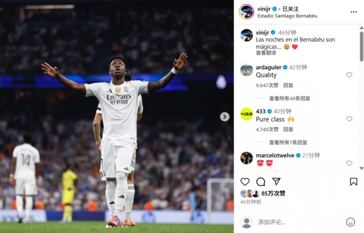 维尼修斯写道:在伯纳乌的神奇夜晚😉❤️英超足球现场直播在线直播观看免费