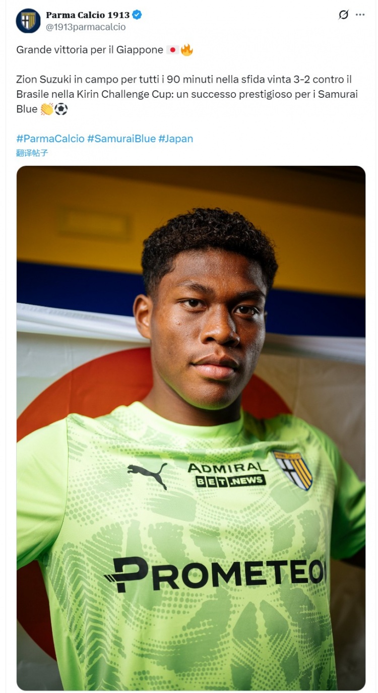 日本3-2击败巴西,帕尔马官方社媒祝贺铃木彩艳