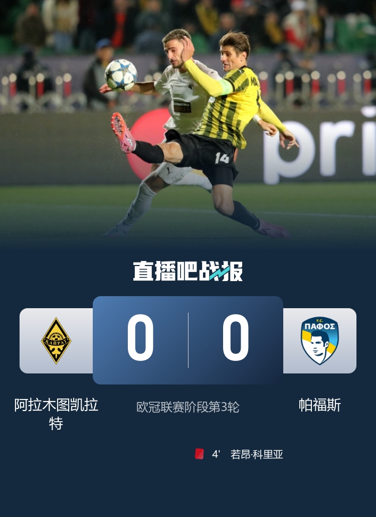 德拉戈米尔得分 被吹,阿拉德射中立柱,最终阿拉木图凯拉特0-0帕福斯。