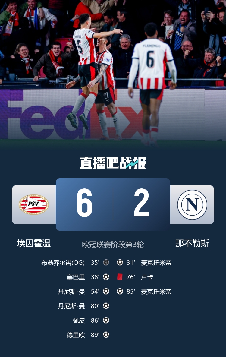 近5场3负!十人那不勒斯2-6大败 埃因霍温 麦克托米奈双响卢卡染红
