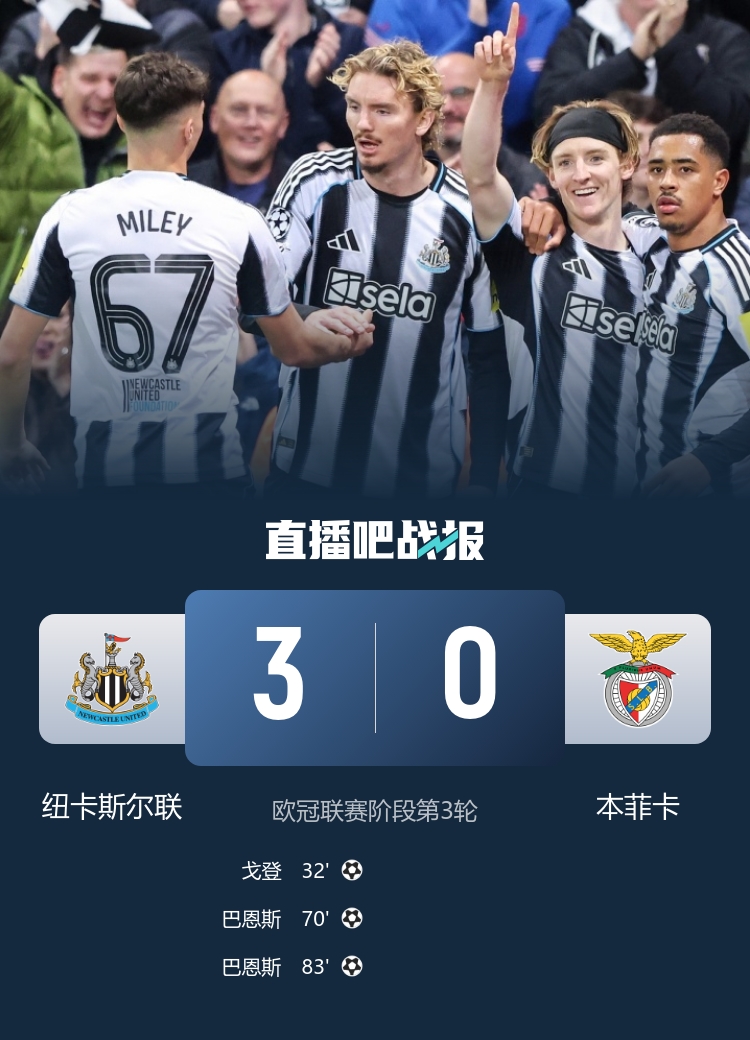 两连胜!纽卡3-0本菲卡 戈登建功巴恩斯双响 本菲卡欧冠3连败