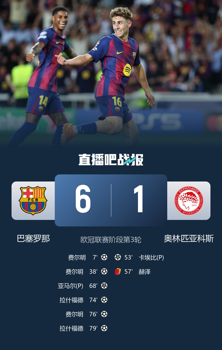 费尔明戴帽,拉什福德双响,巴萨6-1大胜十人奥林匹亚科斯。