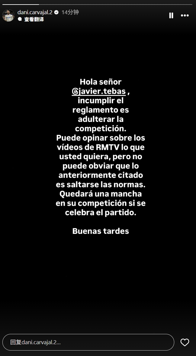 卡瓦哈尔回应特巴斯:随你怎么说皇马TV,但海外赛就是违反规则