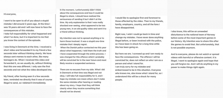 我也深知,这将在挪威国家队迎来史上最重要赛事之际,造成不必要的干扰。我本打算在赛事结束后公布此事以避免影响,可惜已无法实现。
