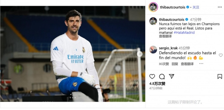 9月30日讯 在皇马客战阿拉木图凯拉特的欧冠赛事 前,皇马守门员库尔图瓦发文鼓励了球队。